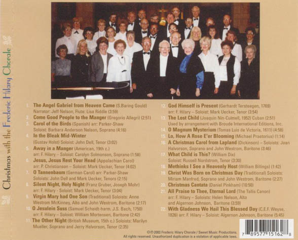 Christmas with The Frederic Hilary Chorale, a Sweet Music Production Digitally restored and remastered, 22 classical Christmas favorites. Add to your holiday music collection these traditional carols from America, Appalachia, Cuba, Germany, Great Britain, Lapland and Spain. Disc highlights include Conductor Frederic Hilary�s arrangements and Pianist Joyce Hilary�s skill and artistry. Mrs. Hilary died September 6, 2006 and will be dearly missed by all the many Hilary Chorale members. This CD was produced in October of 2003 for Joyce to hear and enjoy. Frederic Hilary (1908-1994) graduated from the Juilliard School of Music in New York City, the Eastman School of Music in Rochester, N.Y., and earned a master�s degree from the University of Wisconsin-Madison. He began his conducting career at Gustavus Adolphus College in St. Peter, Minnesota where he taught for 14 years and founded the Gustavus Symphony Band. Hilary was the minister of music and choir conductor at Central Lutheran Church in Minneapolis for 24 years. He founded the Frederic Hilary Chorale in 1954 and conducted it for 38 years, until its last performance in 1992. The skillful and disciplined Frederic Hilary Chorale�s purpose was to explore rarely-heard choral works and to perform for �the joy of singing.� To order the 79-minute Christmas with the Frederic Hilary Chorale CD, call (612) 240-0416. Or send a $20 check payable to Sweet Music Productions, PO Box 2116, Burnsville, MN 55337. The song you are listening to is called, Since You�ve Asked, a Judy Collins song, sung by Anne McKinney, a ten-year member of the Frederic Hilary Chorale, proud niece of Joyce and Frederic Hilary, and who is happy to mail you a Hilary Chorale CD. Call Anne at (612) 240-0416 to schedule organizing services, interior decorating, home staging, marketing consulting, radio spot production, press release writing, brochures and website design. Click on the following links to see website design work samples: www.lakevilletownbaseball.com Organizing Services, Interior Decorating and Home Staging Testimonial: